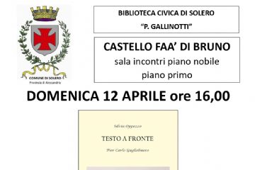 Evento passatoLa Biblioteca Civica di Solero organizza per domenica 12 aprile alle ore 16,00 presso la Sala Incontri del Castello Faà di Bruno in Solero,...
