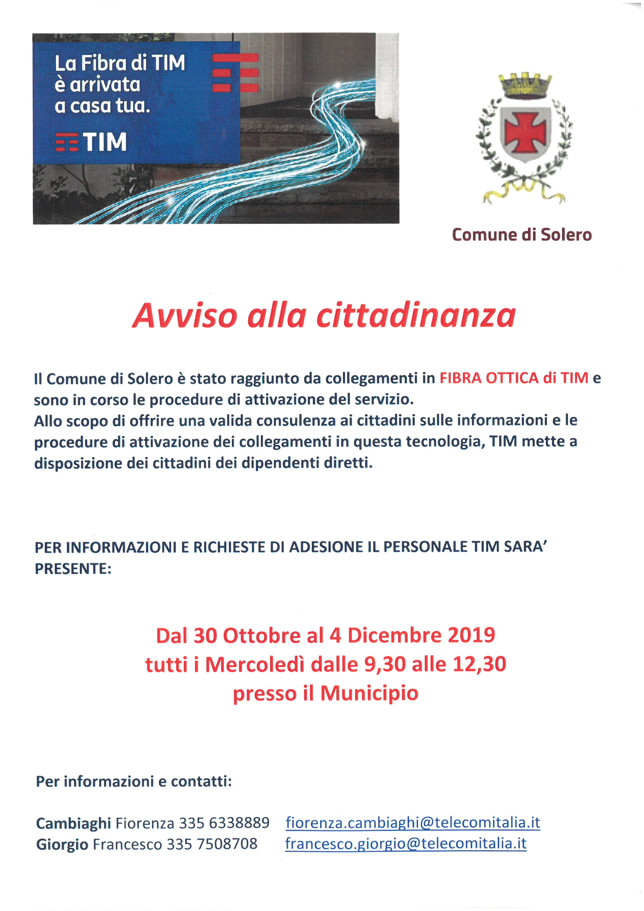 Si comunica che per i nuovi collegamenti in fibra ottica presenti sul territorio di Solero, TIM mette a disposizione due dipendenti per fornire informazioni e consulenza.