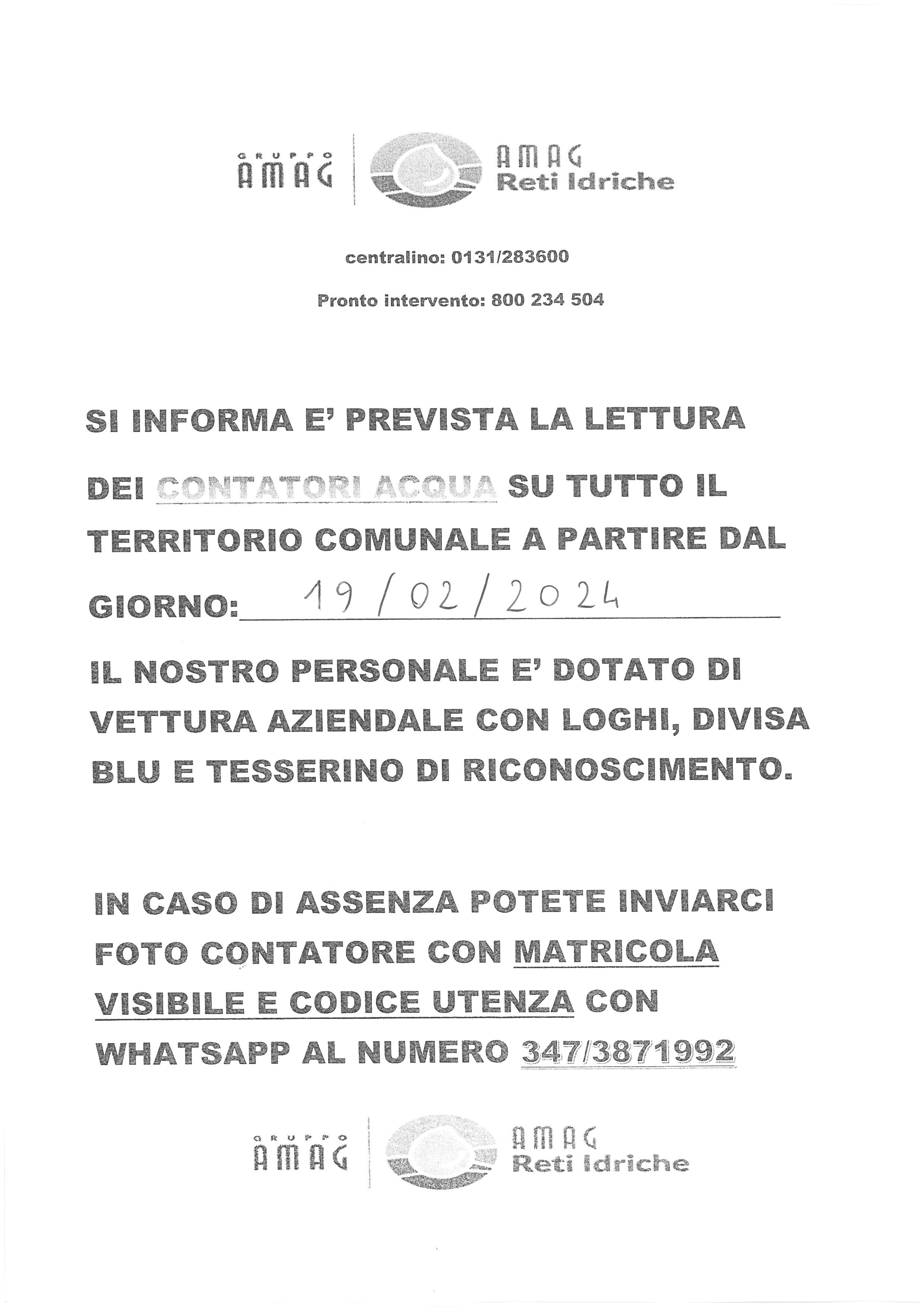 Amag Reti Idriche, comunica che a partire da lunedì 19 febbraio è prevista su tutto il territorio comunale la lettura dei contatori acqua.