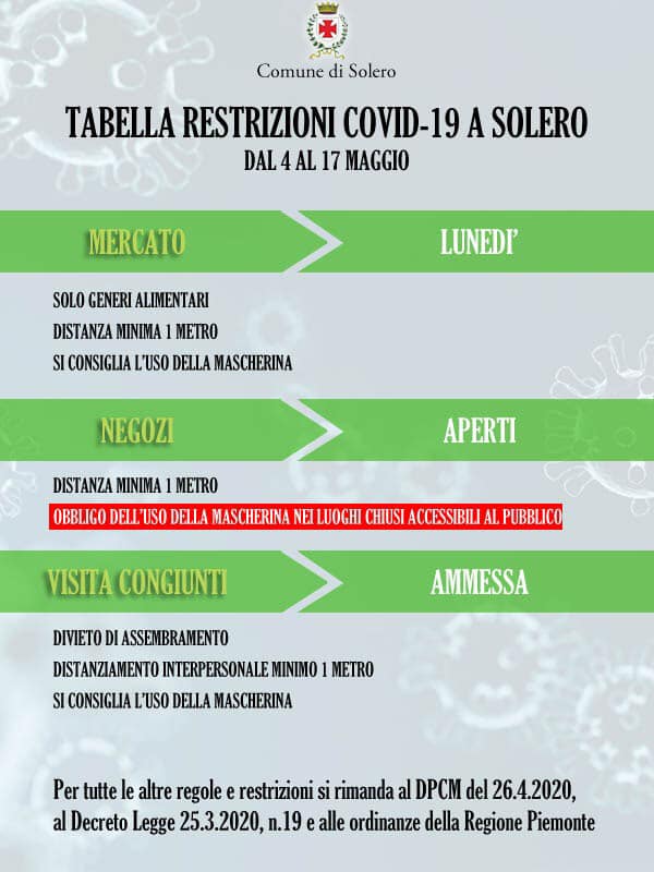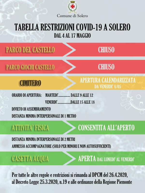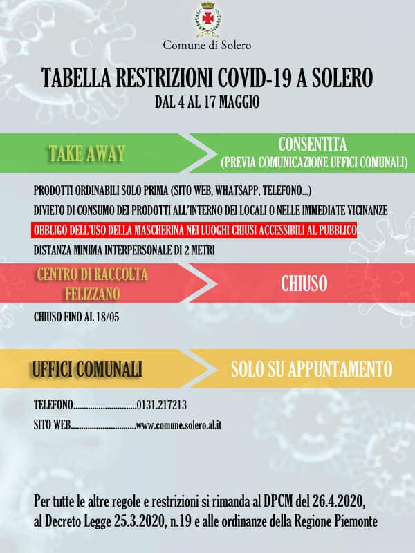 Si allegano tabelle con norme e restrizioni in vigore a Solero dal 4 al 17 maggio c.a.