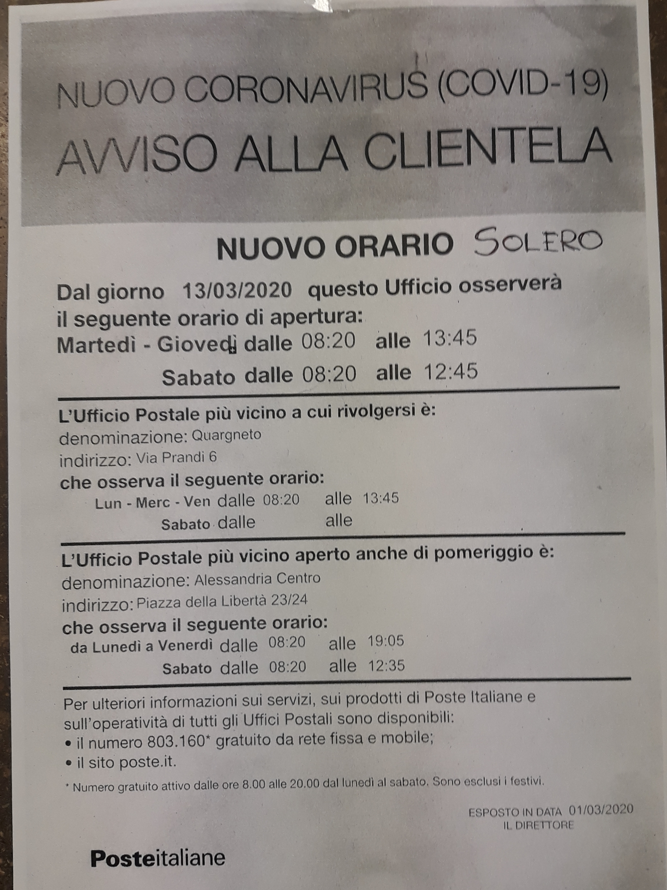 Poste Italiane comunica che dal 13.03.2020 sono modificati gli orari di apertura dell'ufficio postale di Solero.