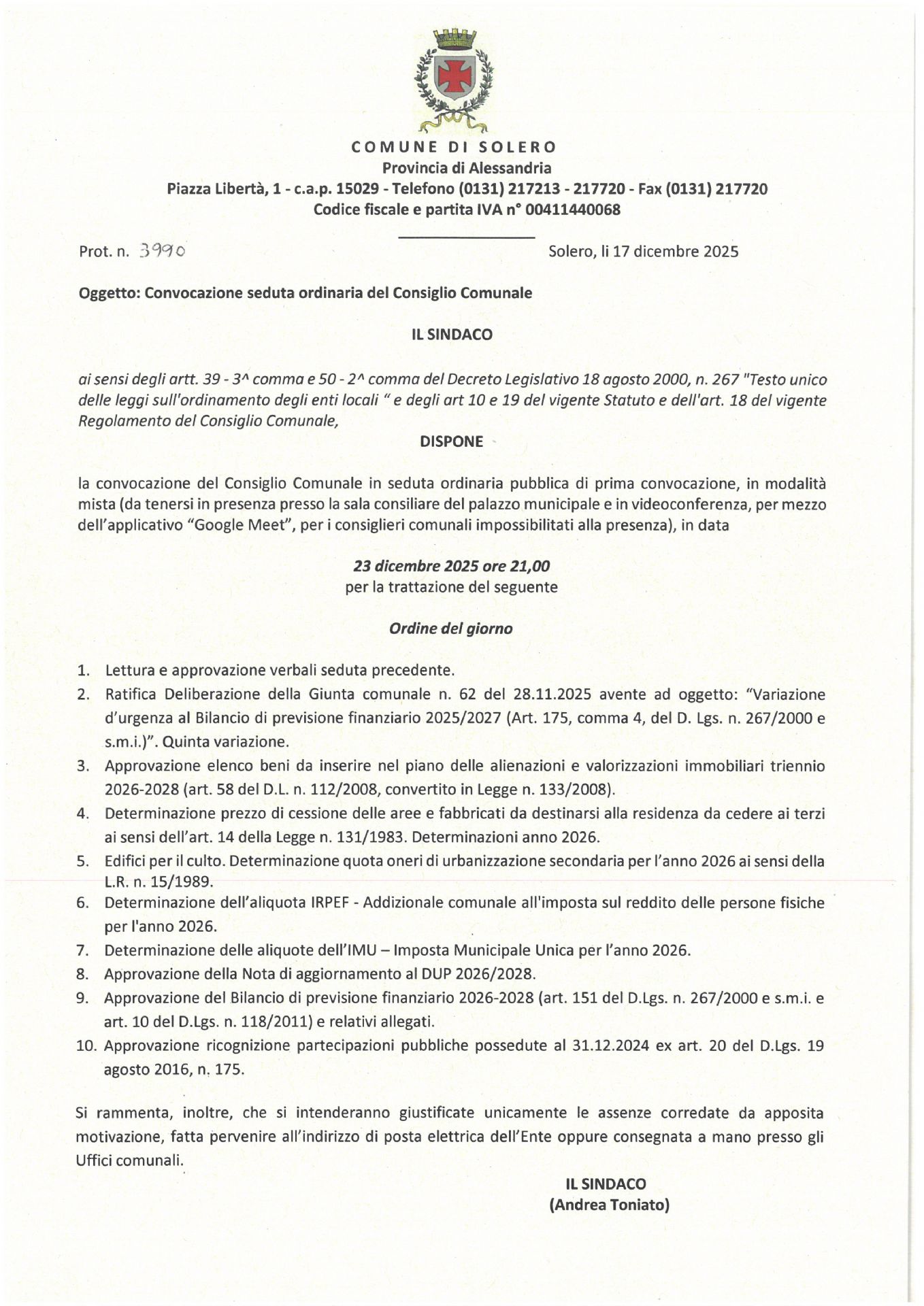 Ordine del giorno del Consiglio comunale del 23 dicembre 2025